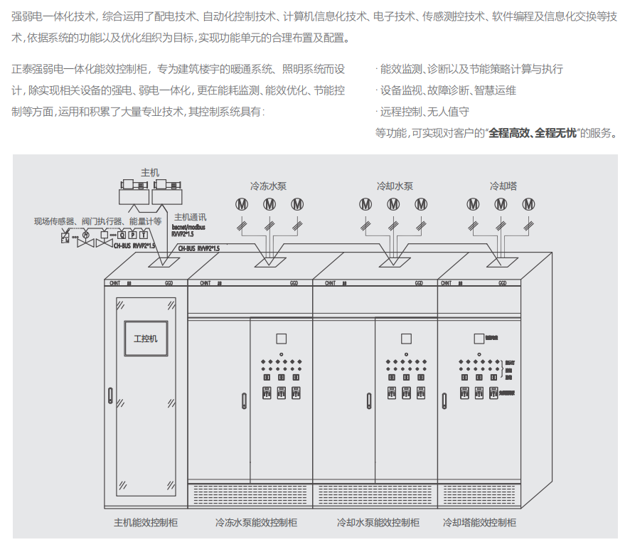 強弱電一體化技術,綜合運用了配電技術、自動化控制技術、計算機信息化技術、電子技術、傳感測控技術、軟件編程及信息化交換等技術,依據系統的功能以及優化組織為目標,實現功能單元的合理布置及配置。 正泰強弱電一體化能效控制柜,專為建筑樓宇的暖通系統、照明系統而設計,除實現相關設備的強電、弱電一體化,更在能耗監測、能效優化、節能控制等方面,運用和積累了大量專業技術。