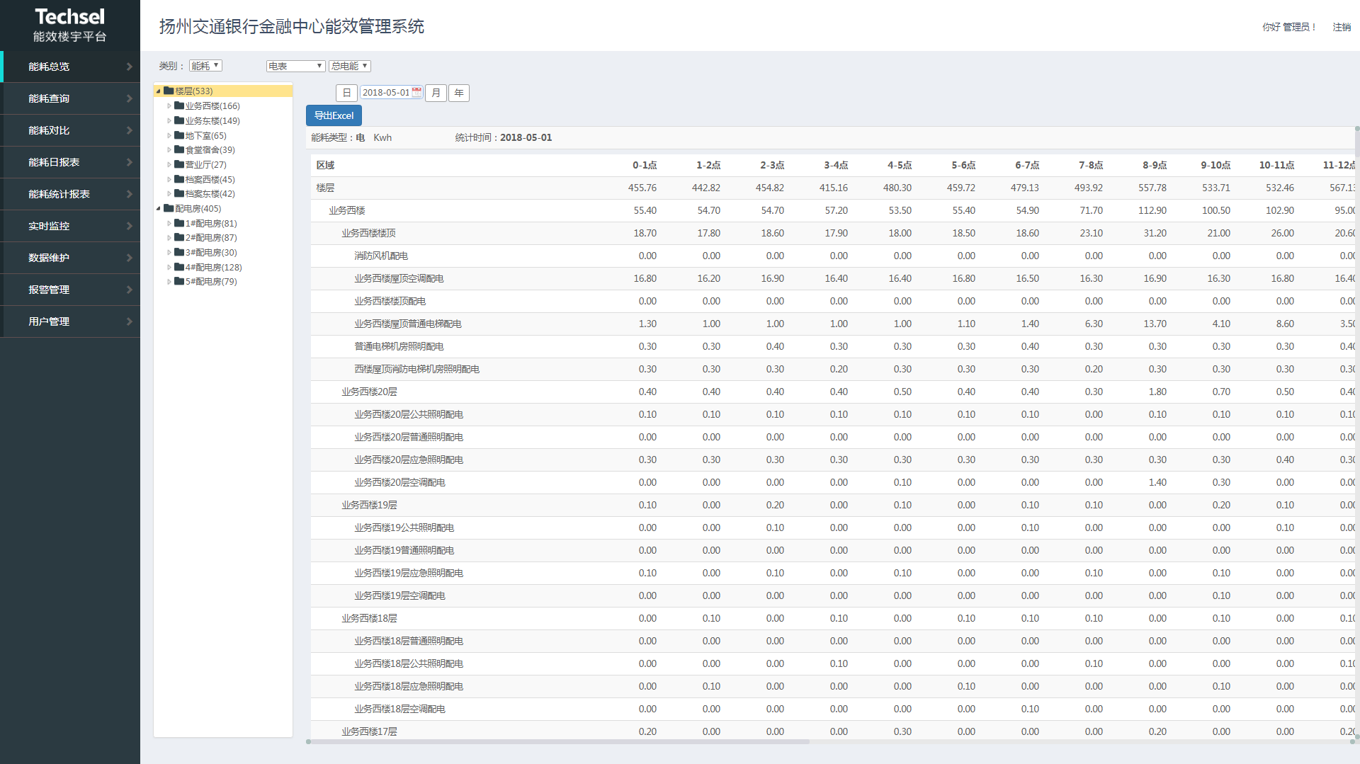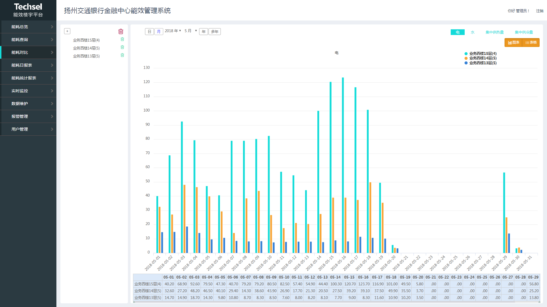 項目實施后,交通銀行(揚州)金融服務中心管理者可隨時掌握各區域電、水綜合能耗和電力設備安全運行情況,并制定科學合理的用能計劃和節能目標。